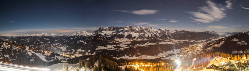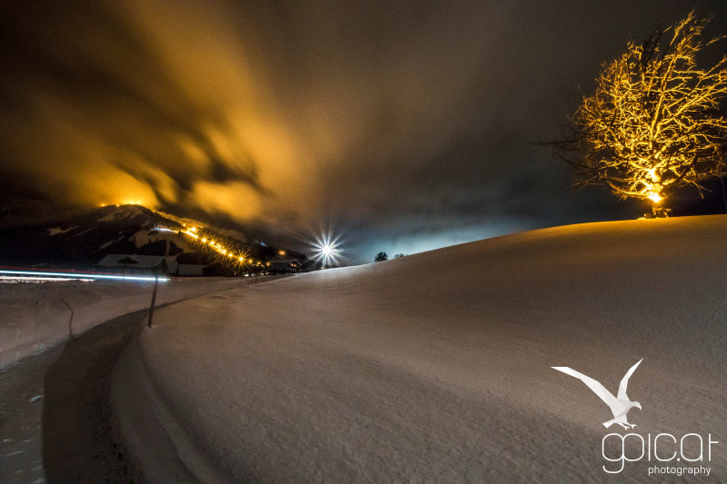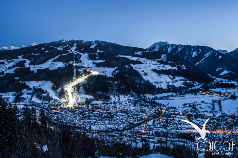 Der hell erleuchtete Zielhang der Planai kurz vor Beginn des Schladminger Nachtslalom, rechts am Bildrand das Haus Talblick