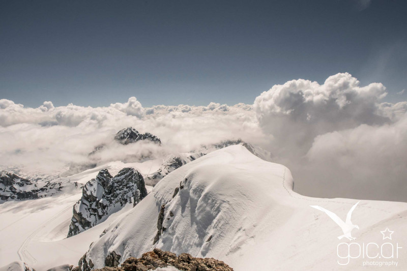 Die Bergstation der Dachstein-Südwandbahn am Hunerkogel umrahmt von eindrucksvoller Wolkenlandschaft.